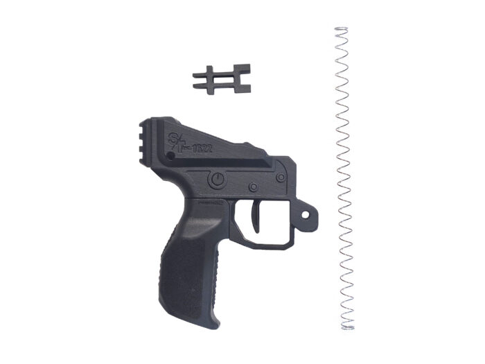 Well, look at that! It’s a FCG housing for your Keltec SU22 (rifle) or PLR22 (pistol) that has a three slot pic rail, uses AR FCG’s and is super easy to install (remove the pins, remove the old body, put the new one in and pop the pins back in place). Available as a complete FCG with mil-spec trigger group AND an Amend2 Grip, or stripped with no grip or trigger components. The choice is yours, but no matter which one you choose, your Keltec is going to love you for it.